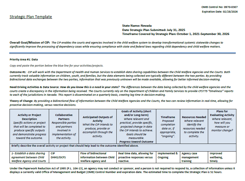 Included below are the Court Improvement Program's previous Strategic Plans submitted to the Children's Bureau as part of its funding applications. If you are interested in accessing the entire self-assessment, please email cip@nvcourts.nv.gov with your request.